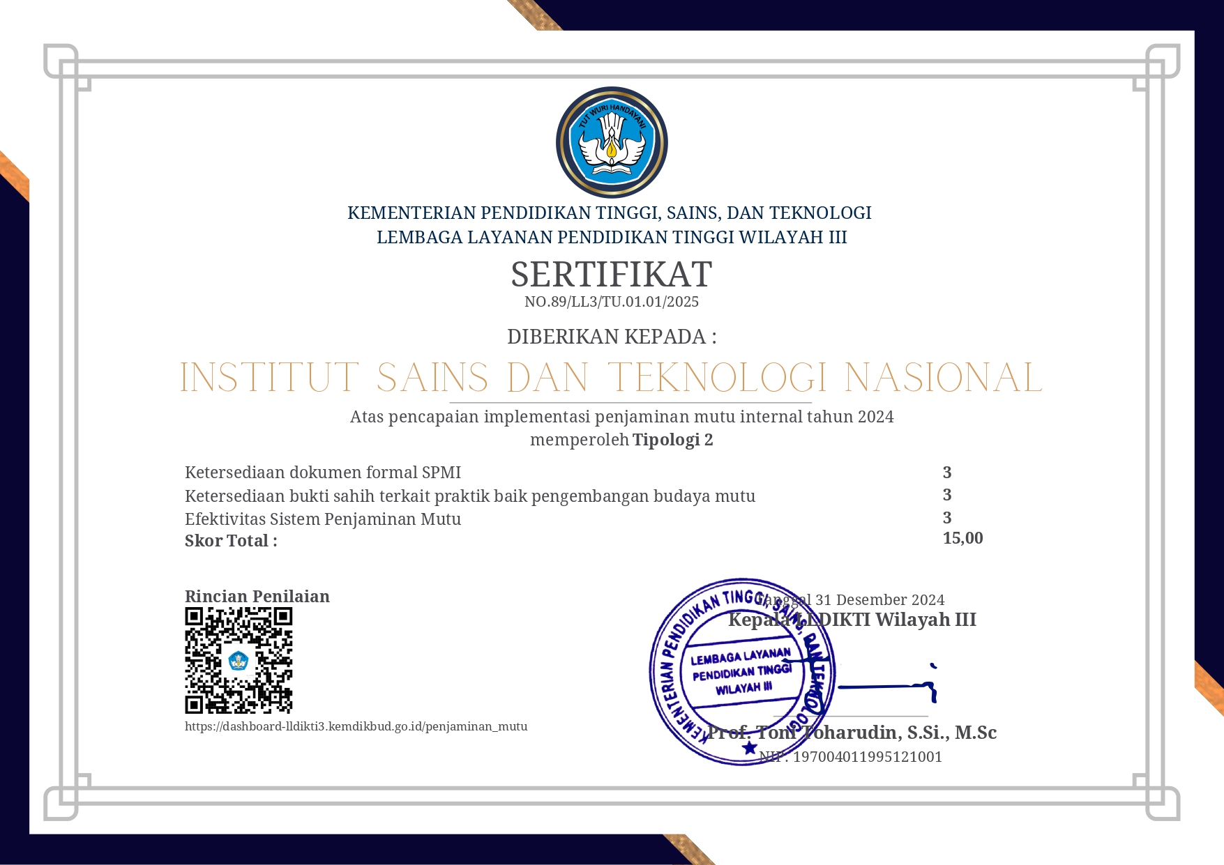 Pada tanggal 30 Desember 2024, Institut Sains dan Teknologi Nasional (ISTN) menerima penghargaan atas implementasi Sistem Penjaminan Mutu Internal (SPMI) Tipologi 2 dengan skor 15.00 dari Kementerian Pendidikan Tinggi, Sains, dan Teknologi (Kemdiktisaintek) melalui Lembaga Layanan Pendidikan Tinggi (LLDIKTI) Wilayah III. Penghargaan ini merupakan bentuk apresiasi atas komitmen ISTN dalam membangun dan mengembangkan budaya mutu akademik yang berkelanjutan.